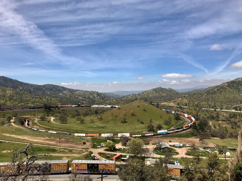 Tehachapi is a small mountain town without many attractions. After a bit of digging Pat found out about the Tehachapi Loop, one of the civil engineering wonders of the world. Completed in 1876, the Loop is a .73 mile spiral through the Tehachapi Pass. Any train of sufficient length will pass over the end of itself as it emerges from a tunnel 75 feet below the upper tracks of the Loop.
