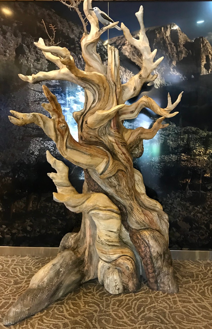Great Basin National Park is home to two groves of ancient bristlecone pines. They grow at an altitude of 10,000 ft and with snow still deep and the last six miles of road to the trailhead closed-we had to content ourselves with this example in the visitor center.