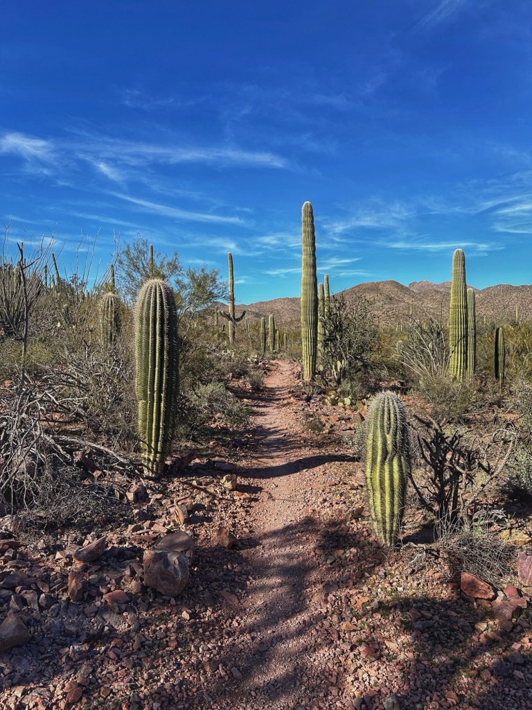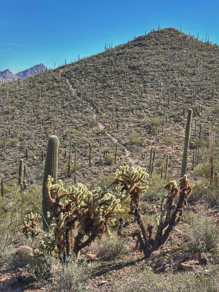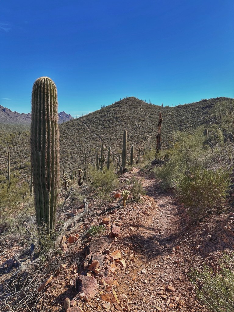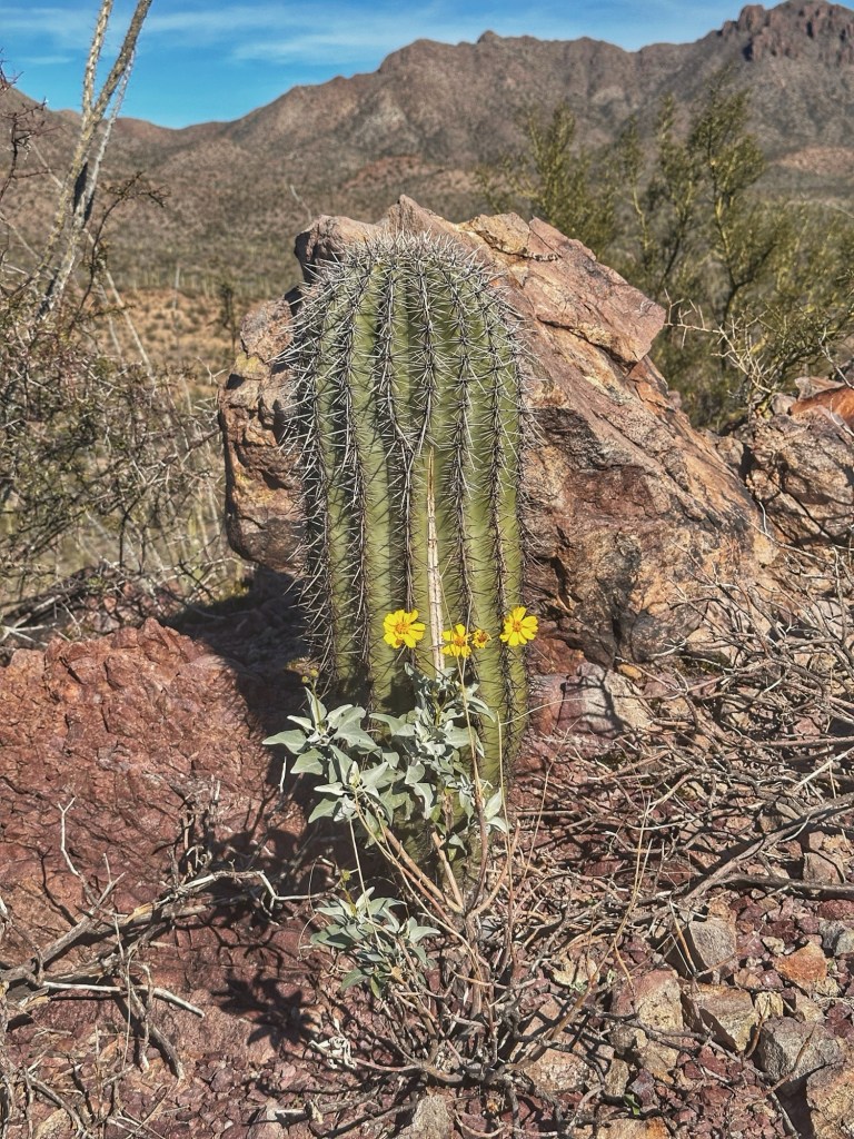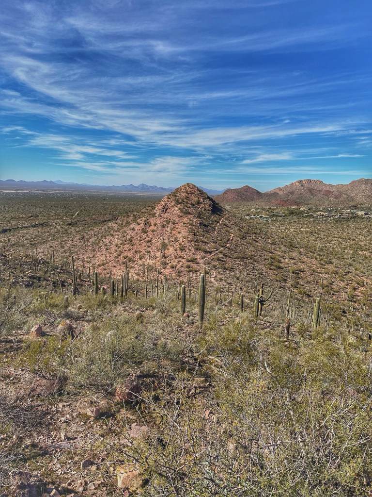 The Brown Mountain Loop Trail is a 5 mile hike that goes up and over Brown Mountain. The trail is located near by in Tucson Mountain Park. We’ve walked this trail a couple of times over the years and have always walked the trail in a clockwise direction. This time we approached the trail counter clockwise.
