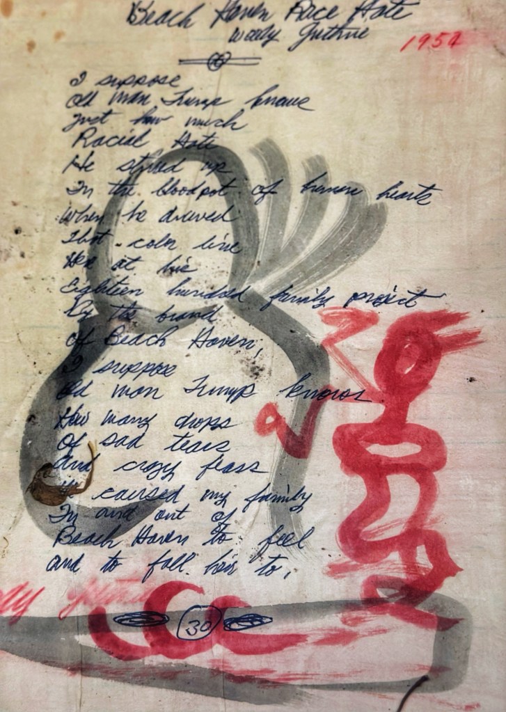 The Center displayed a number of lyric sheets in Woody’s hand. This one is about Fred C. Trump’s (Donald’s father) racist housing policies.