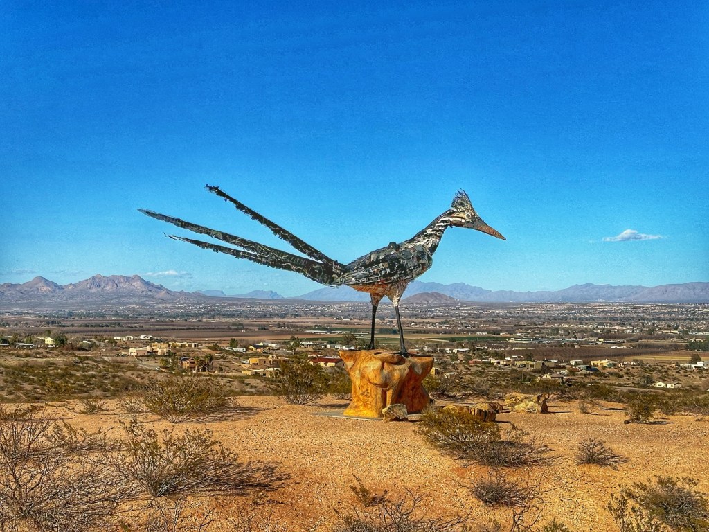 The roadrunner is the official state bird of New Mexico. Along Interstate 10 west of Las Cruces, you’ll find Olin Calk’s giant recycled roadrunner. The sculpture is created from landfill debris.