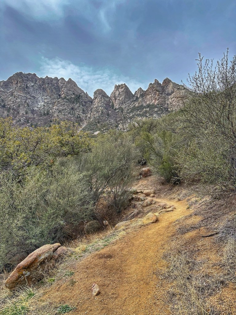Much of the trail runs along a dry creek bed and offers lovely views of the surrounding mountains.