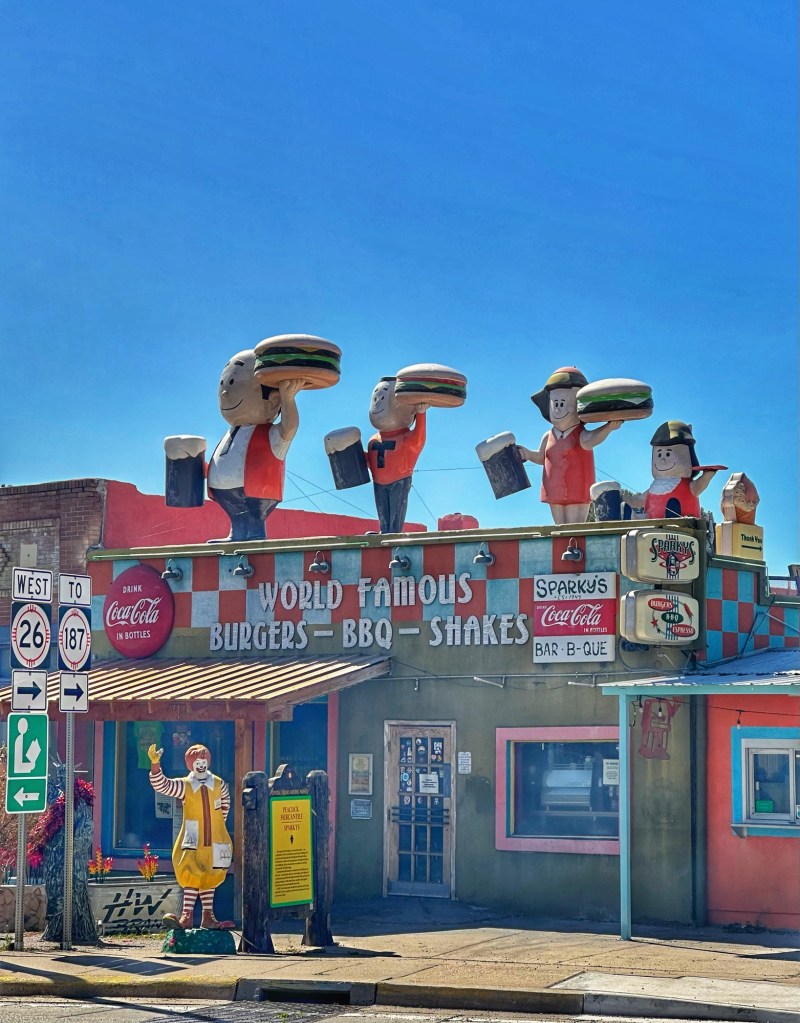 Hatch, New Mexico is an hour drive from Las Cruces and is home to some of the best green chilies available. Fresh chili season is in the Fall but we found some that were roasted and then dried(pasado). No visit to Hatch is complete without a trip to Sparky’s for one of their “world famous” green chili cheeseburgers.
