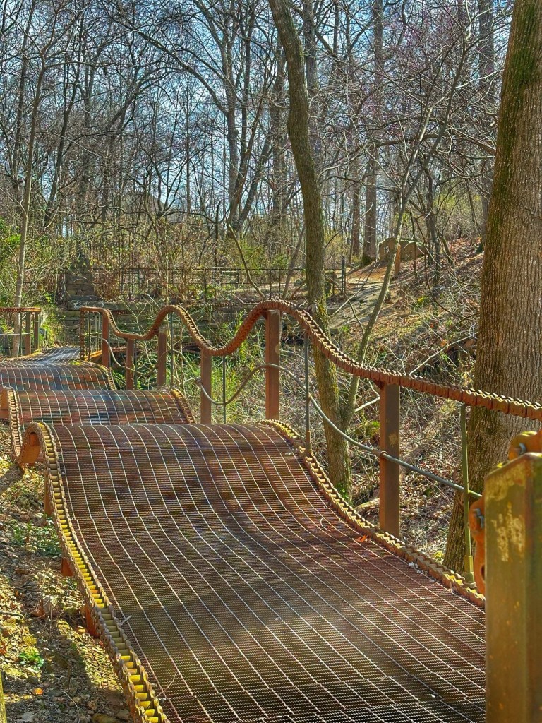 The slopes of the ravines were heavy planted with over 40,000 azalea plants and two suspension bridges were built for viewing the plantings.
