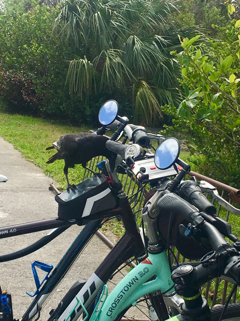 Seven miles out on the trail is an observation tower. We parked our bikes and walked up the tower. When we returned we met this clever crow who figured out how to work a zipper and snag what was stashed away. He(she) got away with out graham crackers.