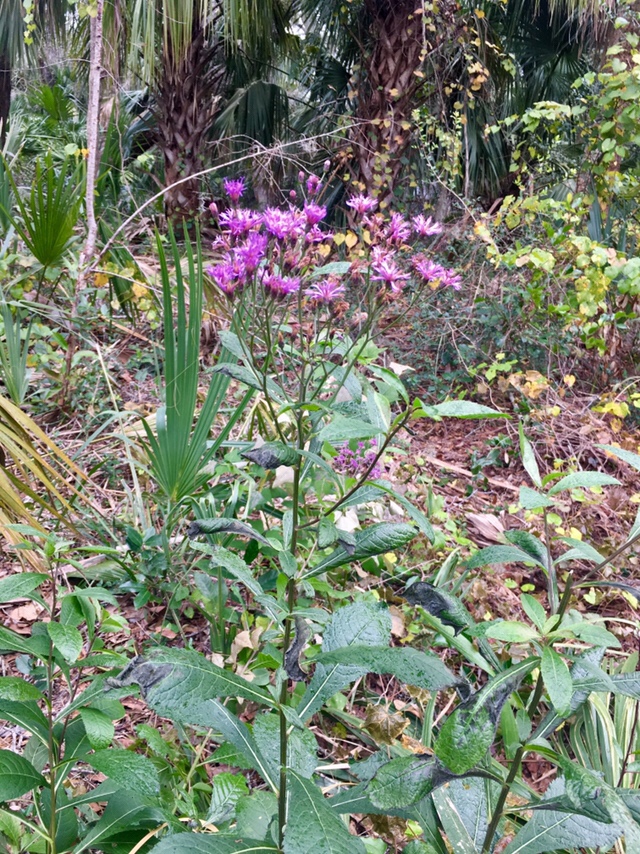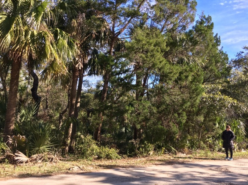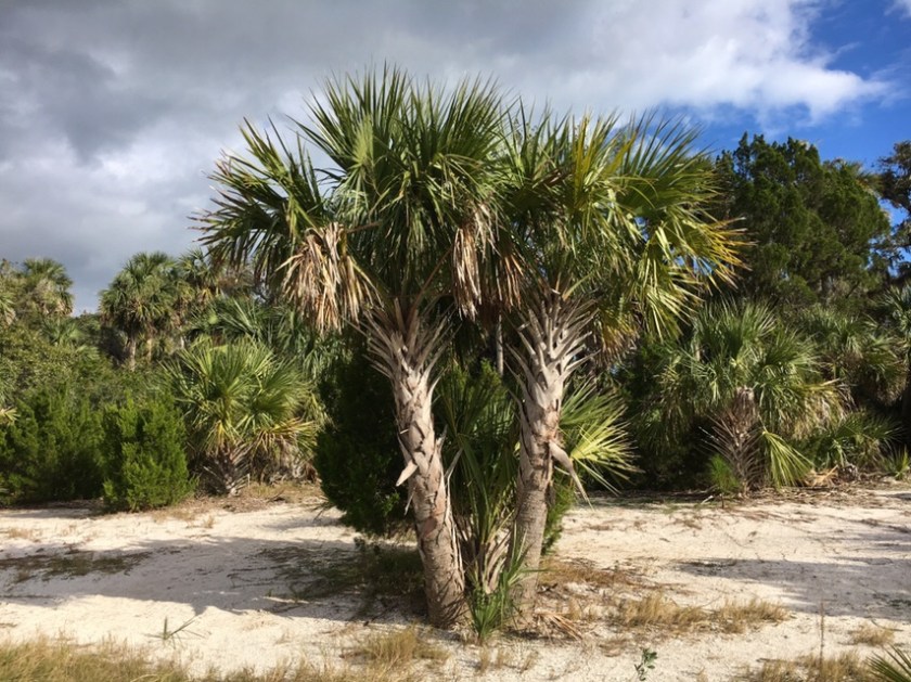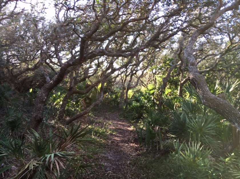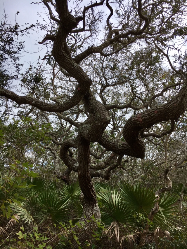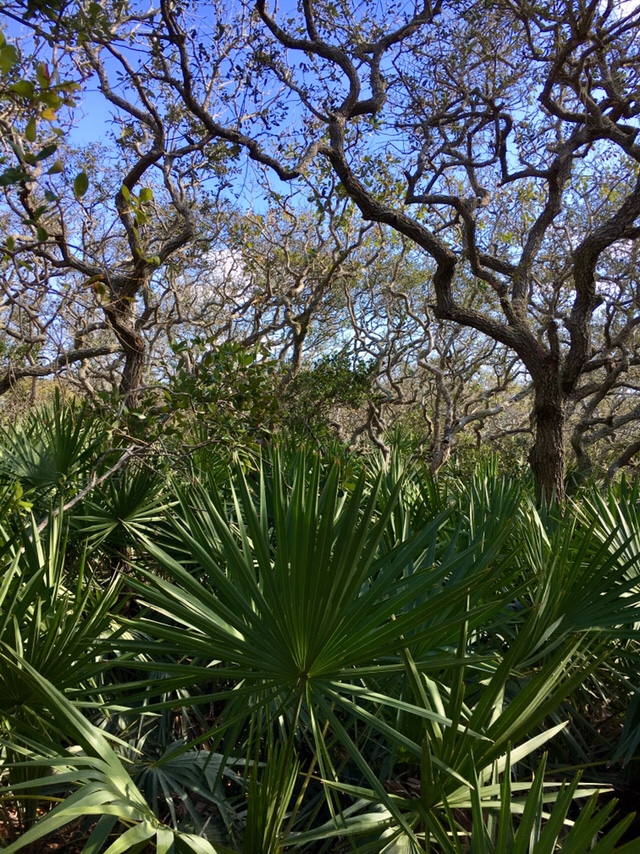 The curiously twisted trees are Sand Live Oak which are surrounded by Saw Palmetto.