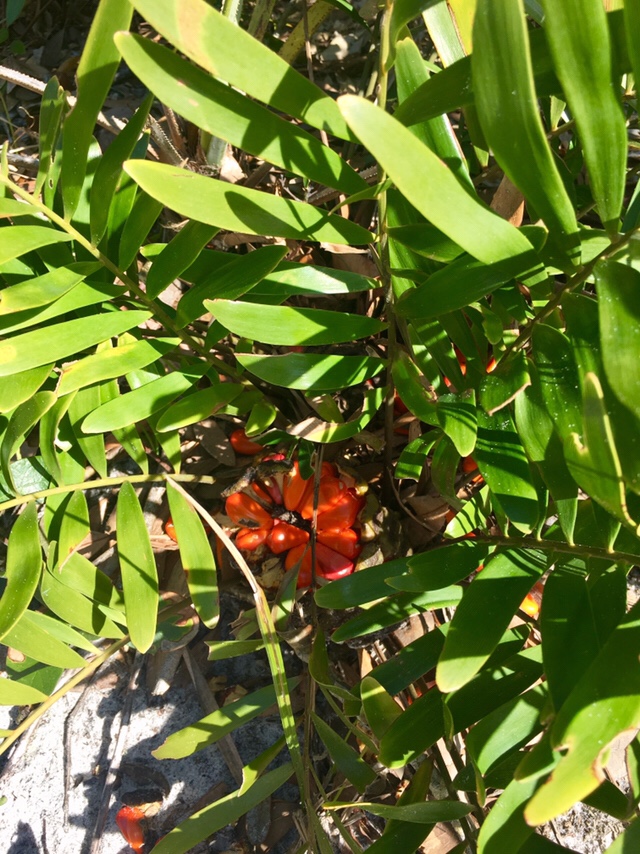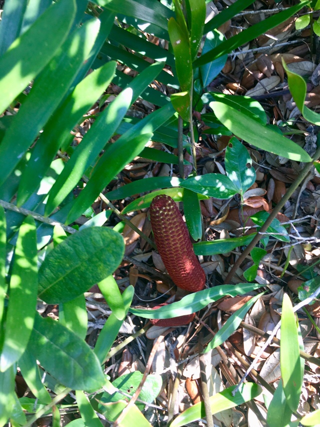 We also also came across this unusual fern like plant called a Coontie. Early settlers in Florida made arrowroot starch from the root of the plant. At the center of the plant a cobb like structure develops that produces a bright orange seed.
