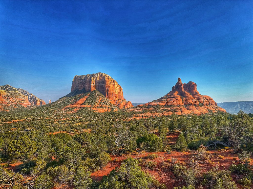 Bell RockBaby Bell Rock Courthouse RockCathedral Rock Courthouse Rock and Bell Rock as seen from Yavapai Vista Point