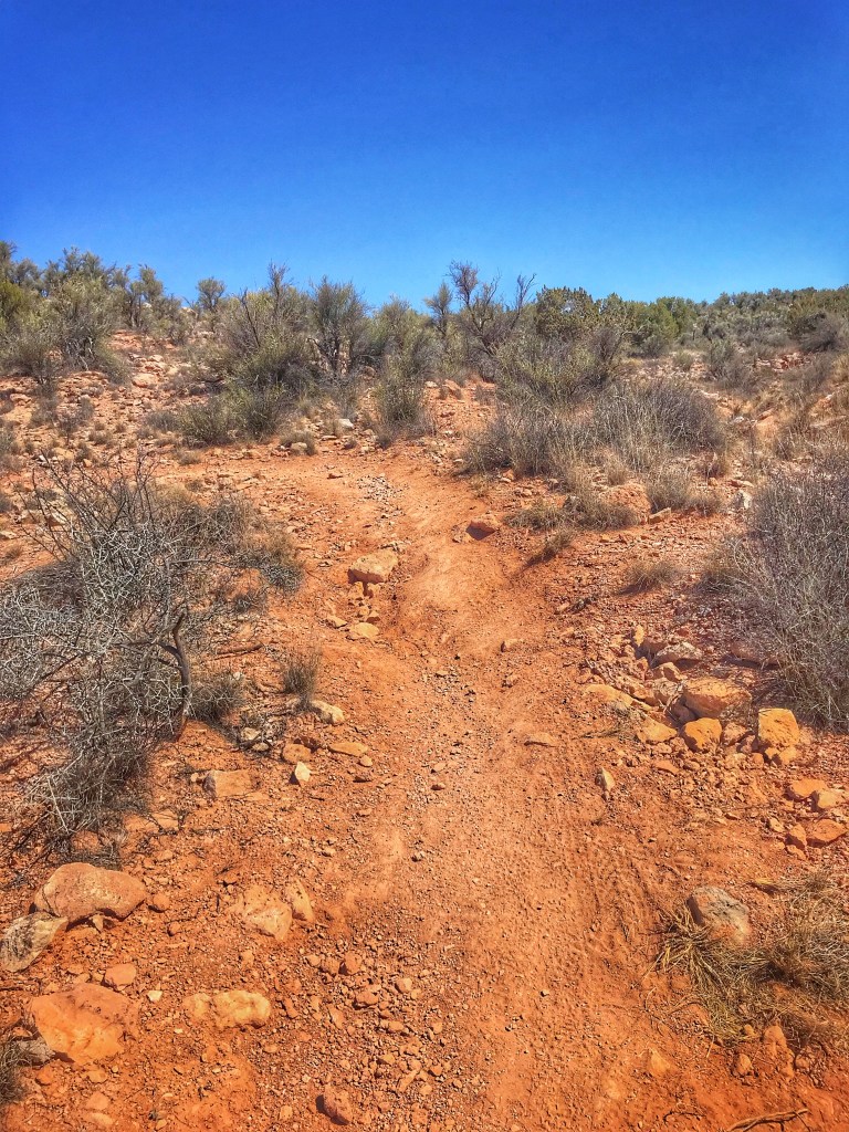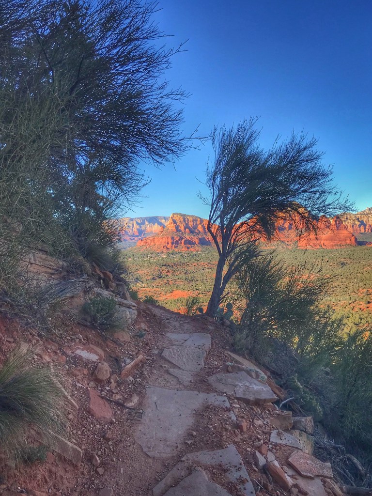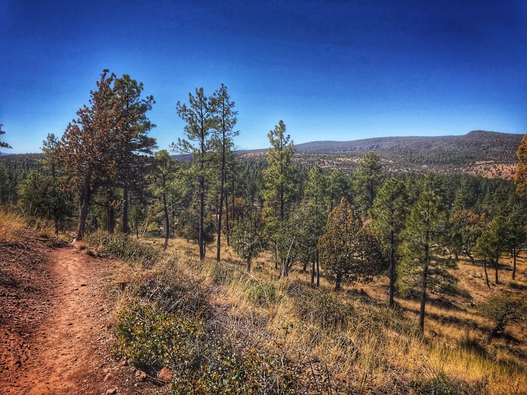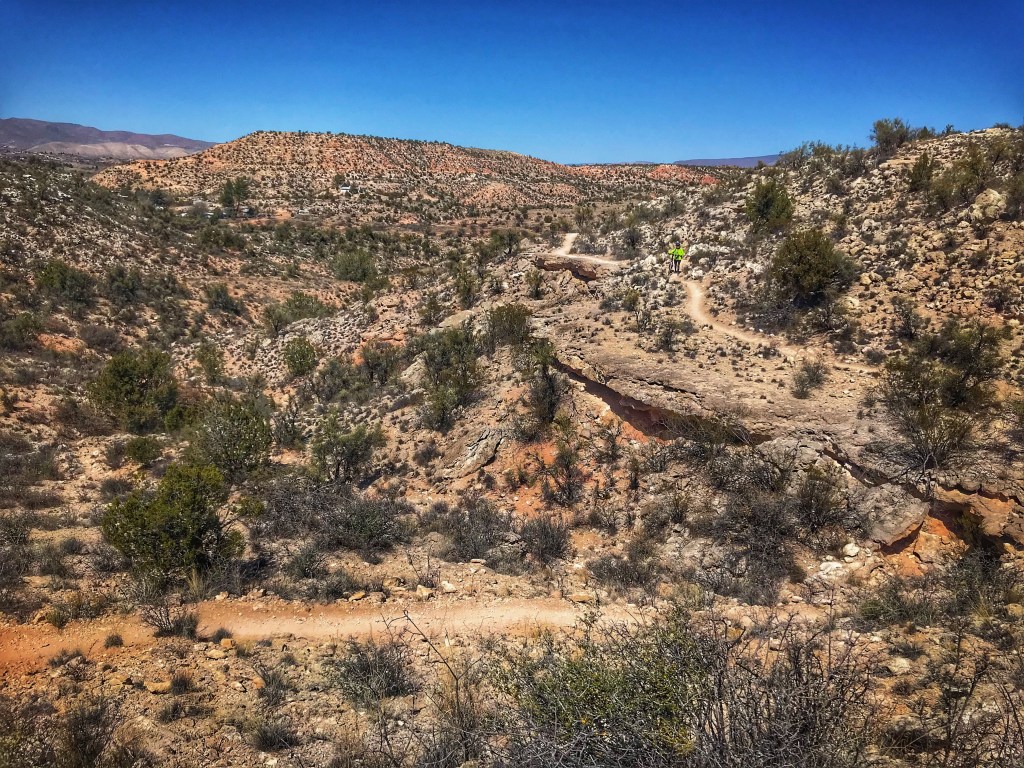 The trail winds along the top of a mesa to a view of the valley below.