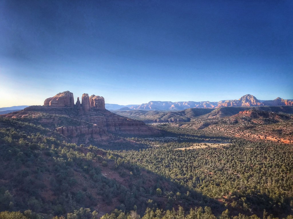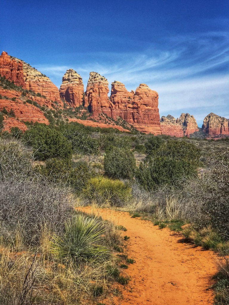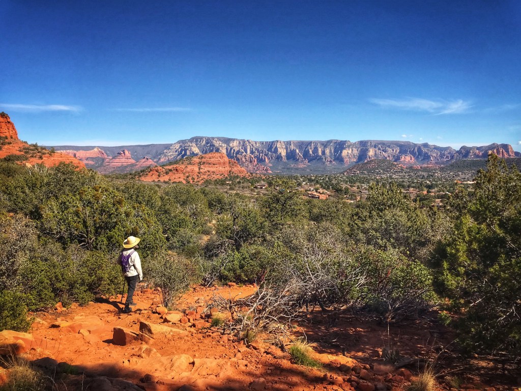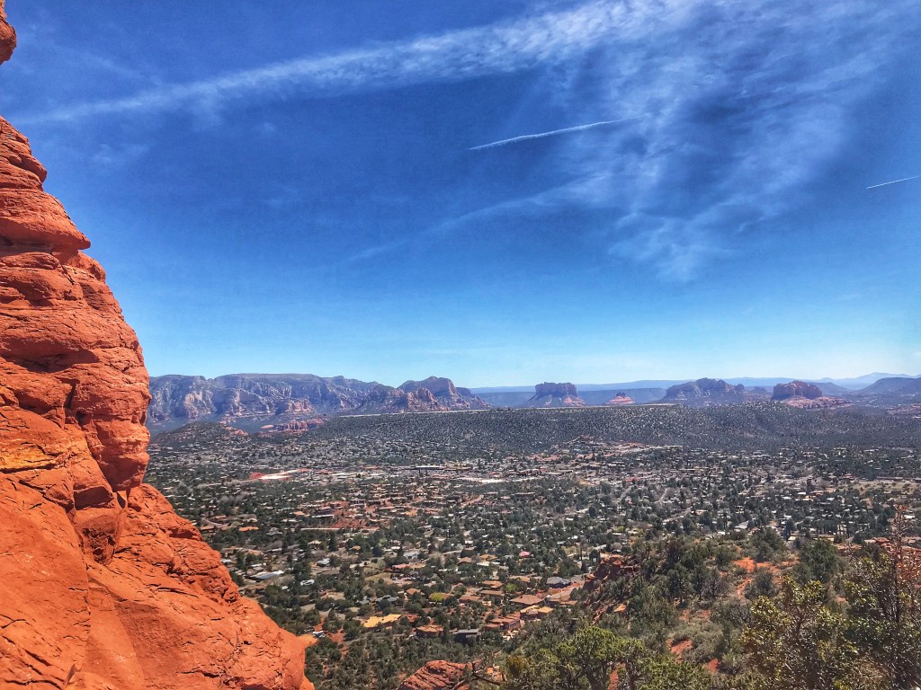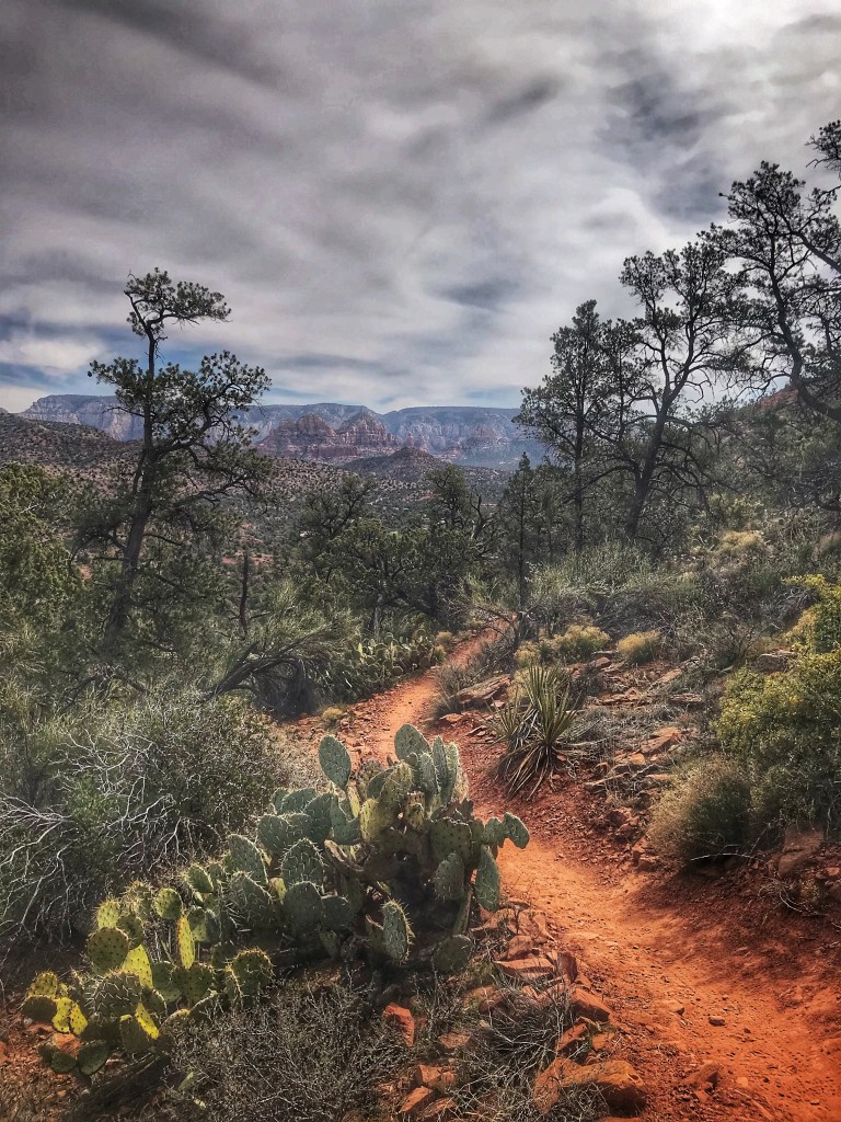 The trail winds along the top of a mesa to a view of the valley below.
